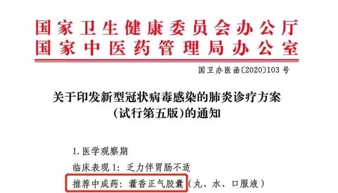 為有效應(yīng)對(duì)新冠肺炎疫情,切實(shí)保障人民群眾健康,國(guó)家衛(wèi)健委最新推出《新型冠狀病毒感染的肺炎診療方案(試行第五版)》,云南云龍制藥生產(chǎn)的國(guó)藥準(zhǔn)字otc甲類(lèi)藥品藿香正氣膠囊,被該方案列為中醫(yī)治療醫(yī)學(xué)觀察期推薦中藥。